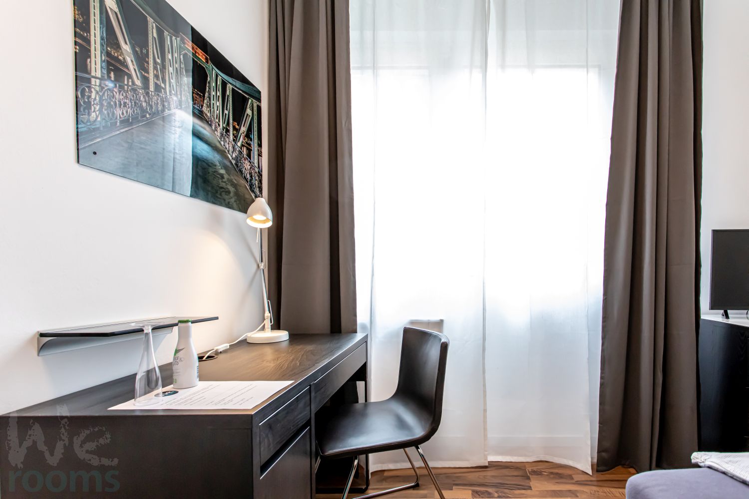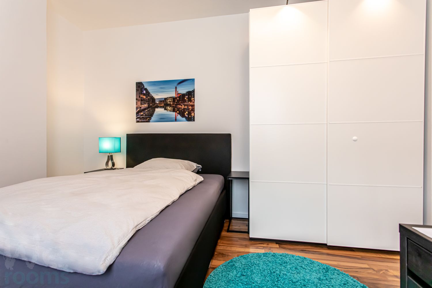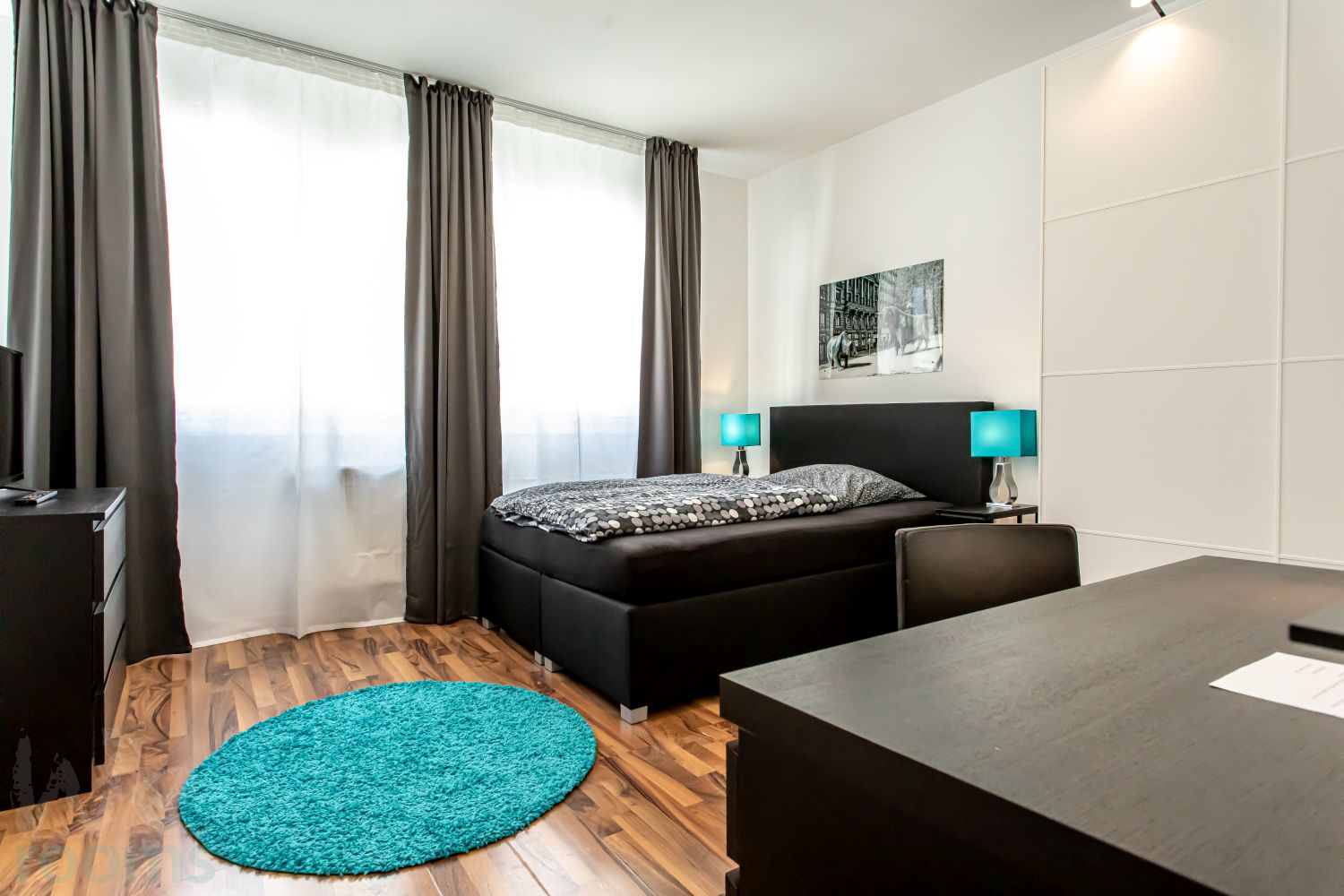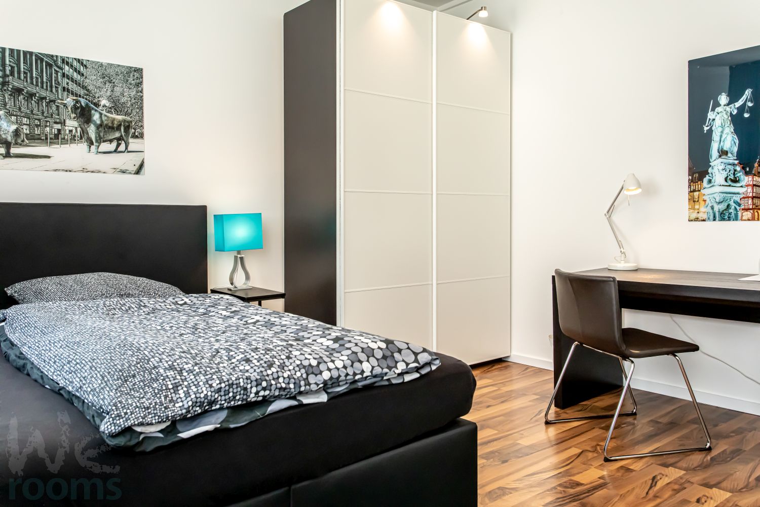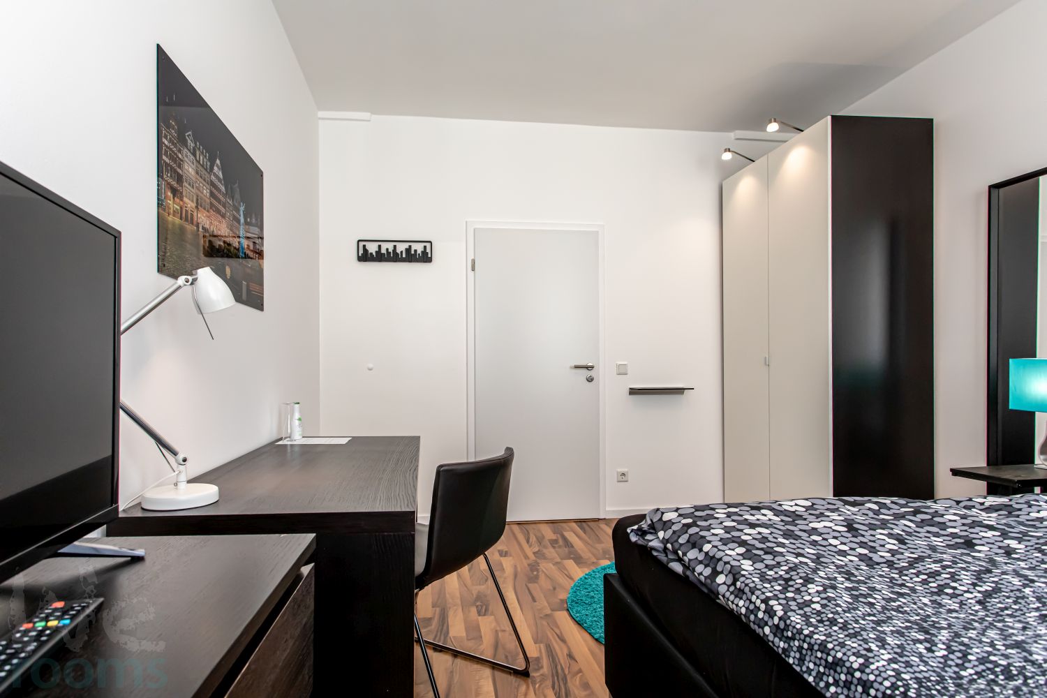 The room furnishings include a comfortable box spring bed, partially illuminated wardrobe, flat-screen TV, side tables, desk, desk chair, bedding (pillow 80×80, duvet 140×200) and matching bed linen. In addition, the shared apartment has central, free Wi-Fi access (25,000 kBit/s) for all residents.