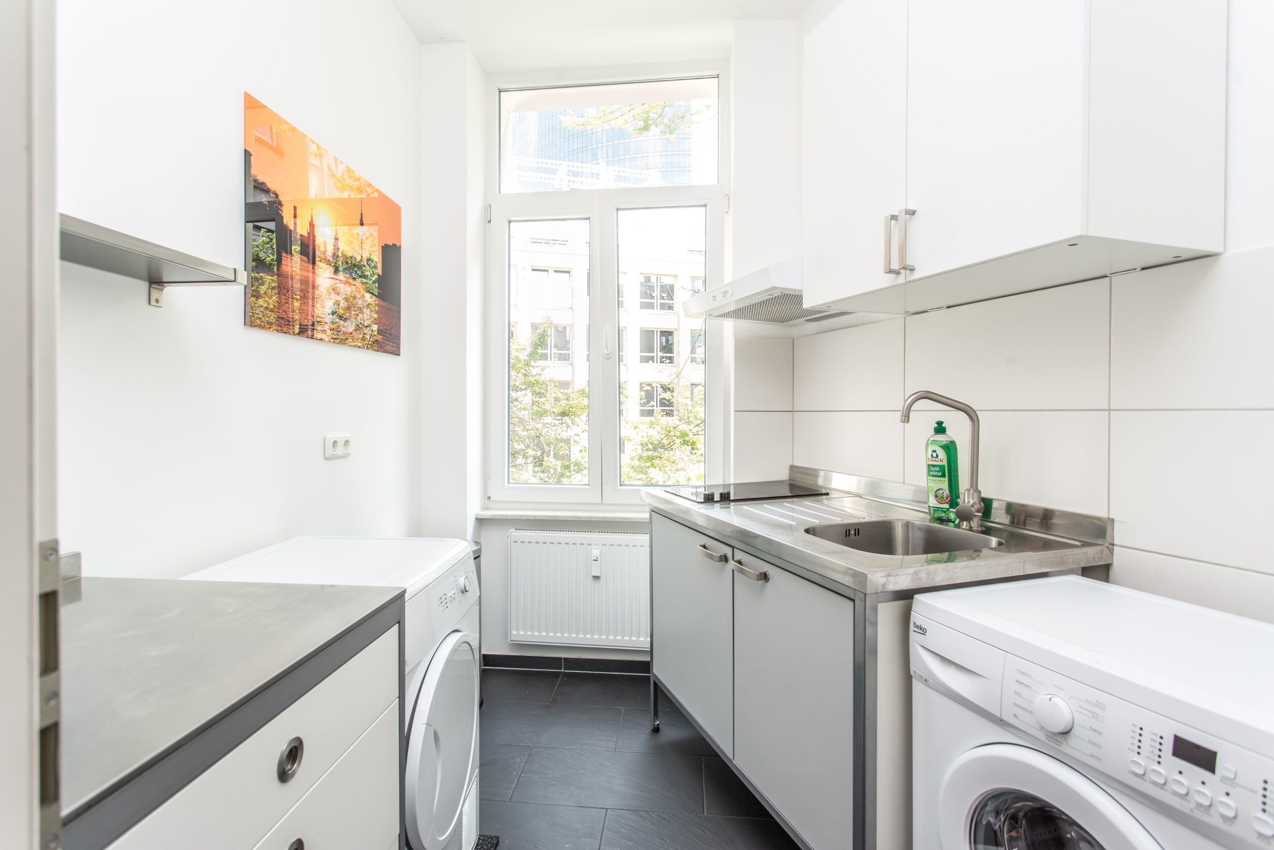 The apartment is very comfortably furnished and equipped with a modern shower room and a small common kitchen, which is already equipped for the residents. A washing machine and dryer are of course also available in the shared apartment.