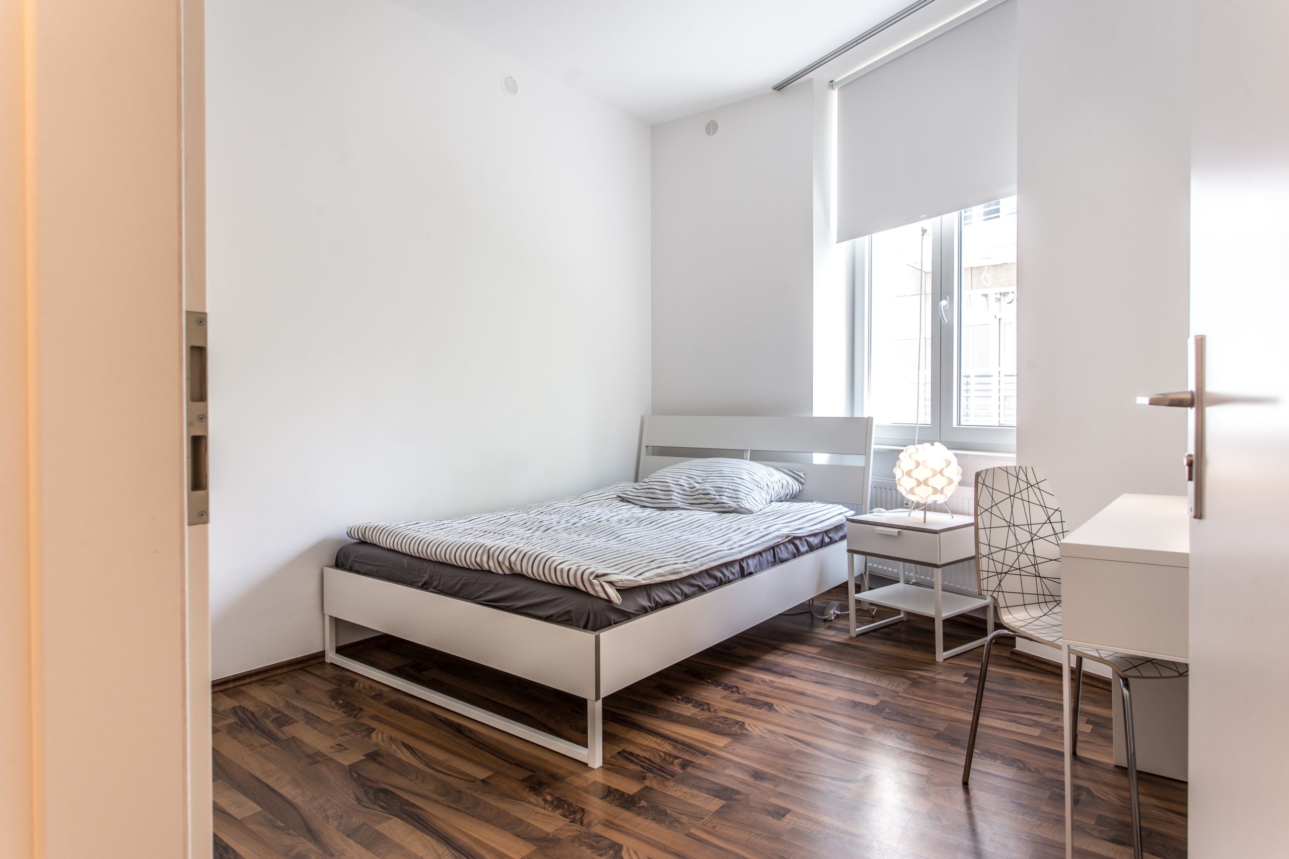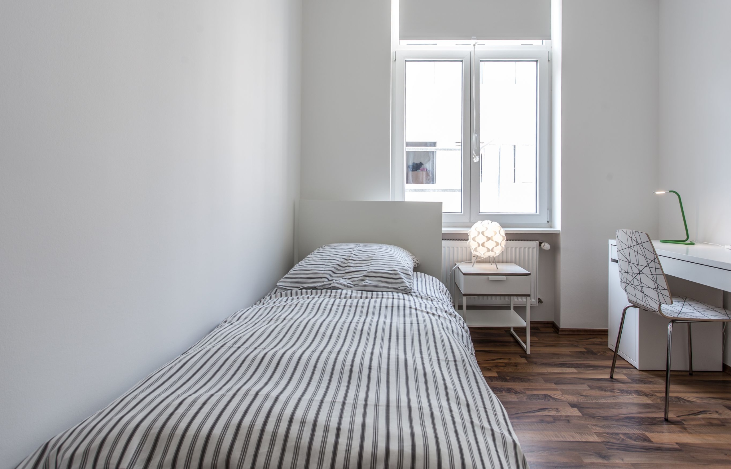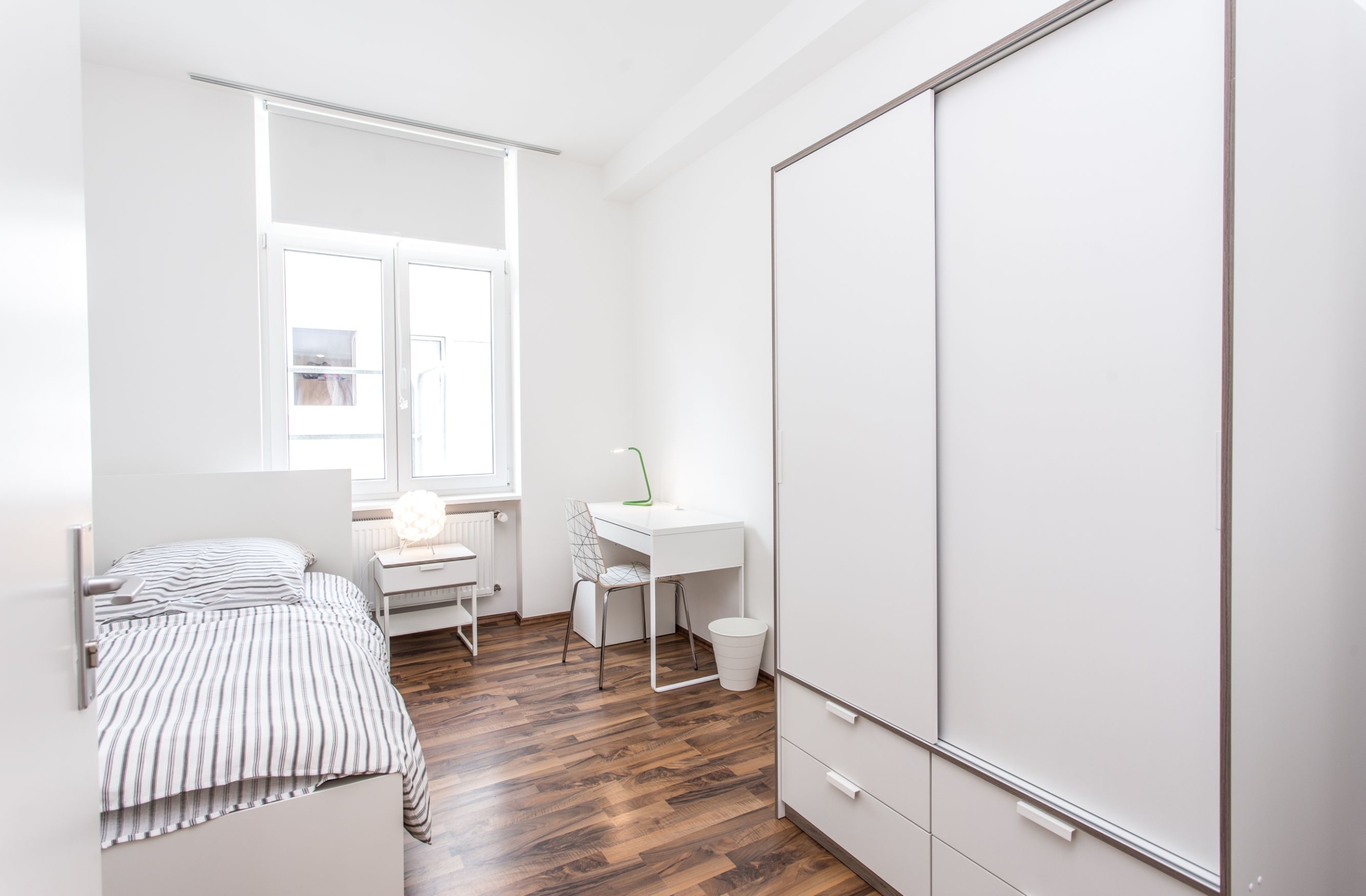 The rooms here are equipped with a bed, wardrobe, bedside table, desk, desk chair, bedding (pillow 80 × 80, duvet 140 × 200) and the fitting linen. In addition, the flat has a central free Wi-Fi access (16,000 kbit / s) for all WG residents.