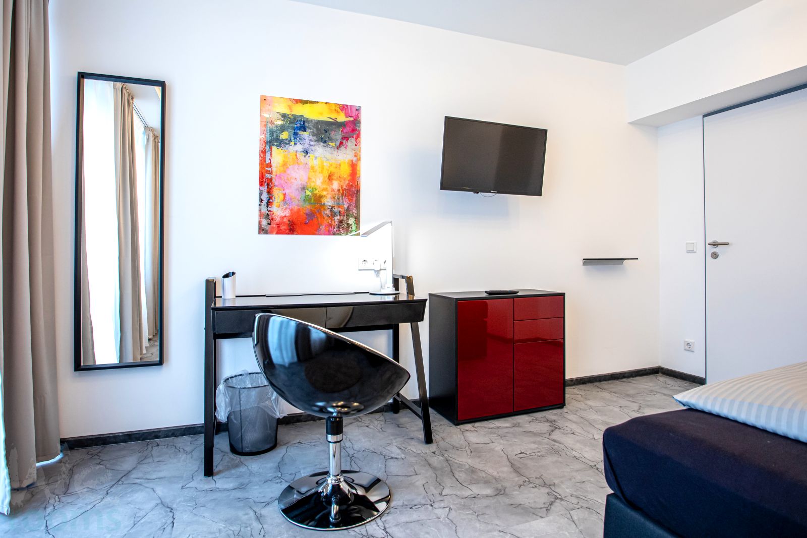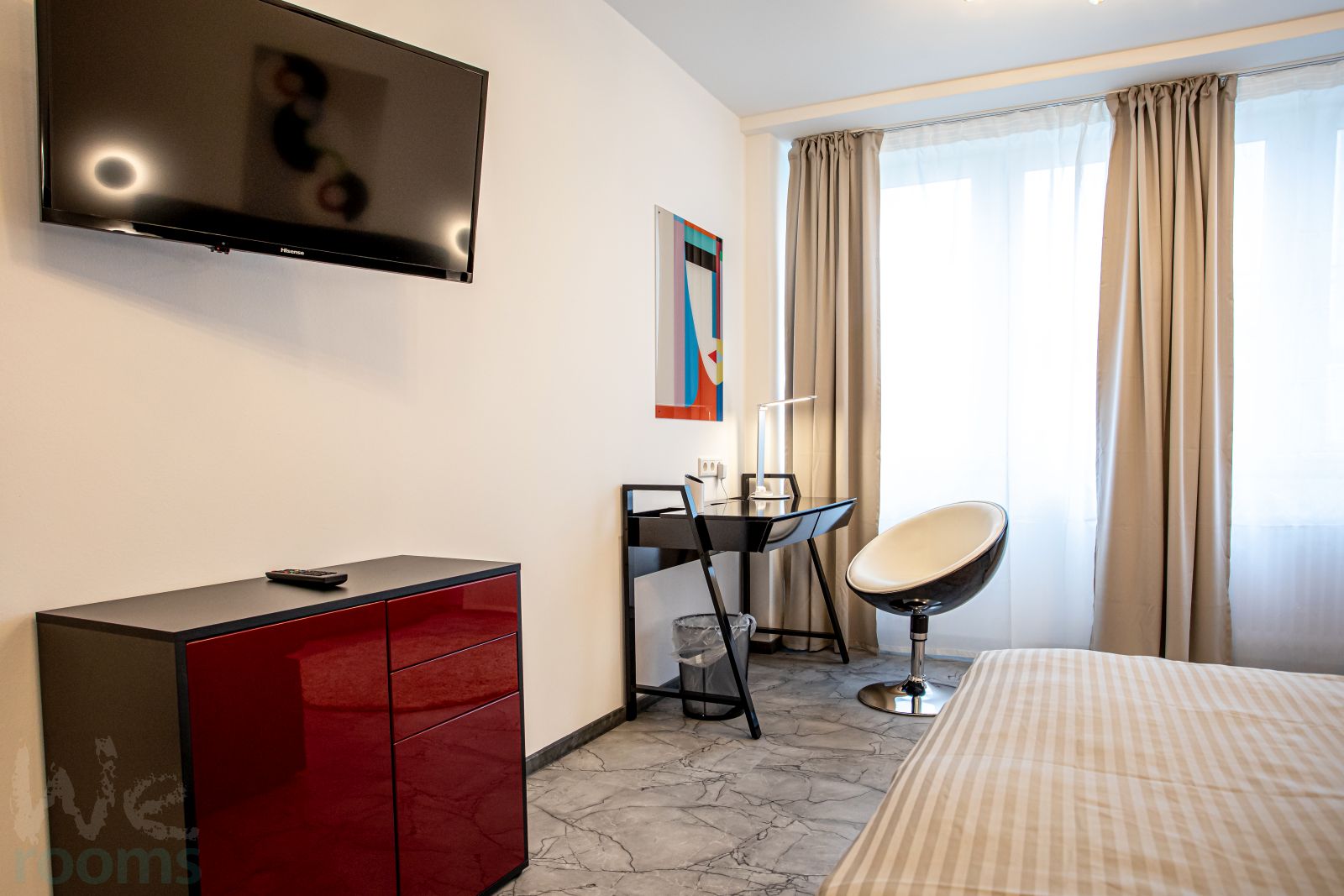 The equipment of each room includes a spacious bed, an open wardrobe, flat screen TV, bedside table, desk, desk chair, bed linen (pillow 80×80, duvet 140×200) and the matching bed covers.