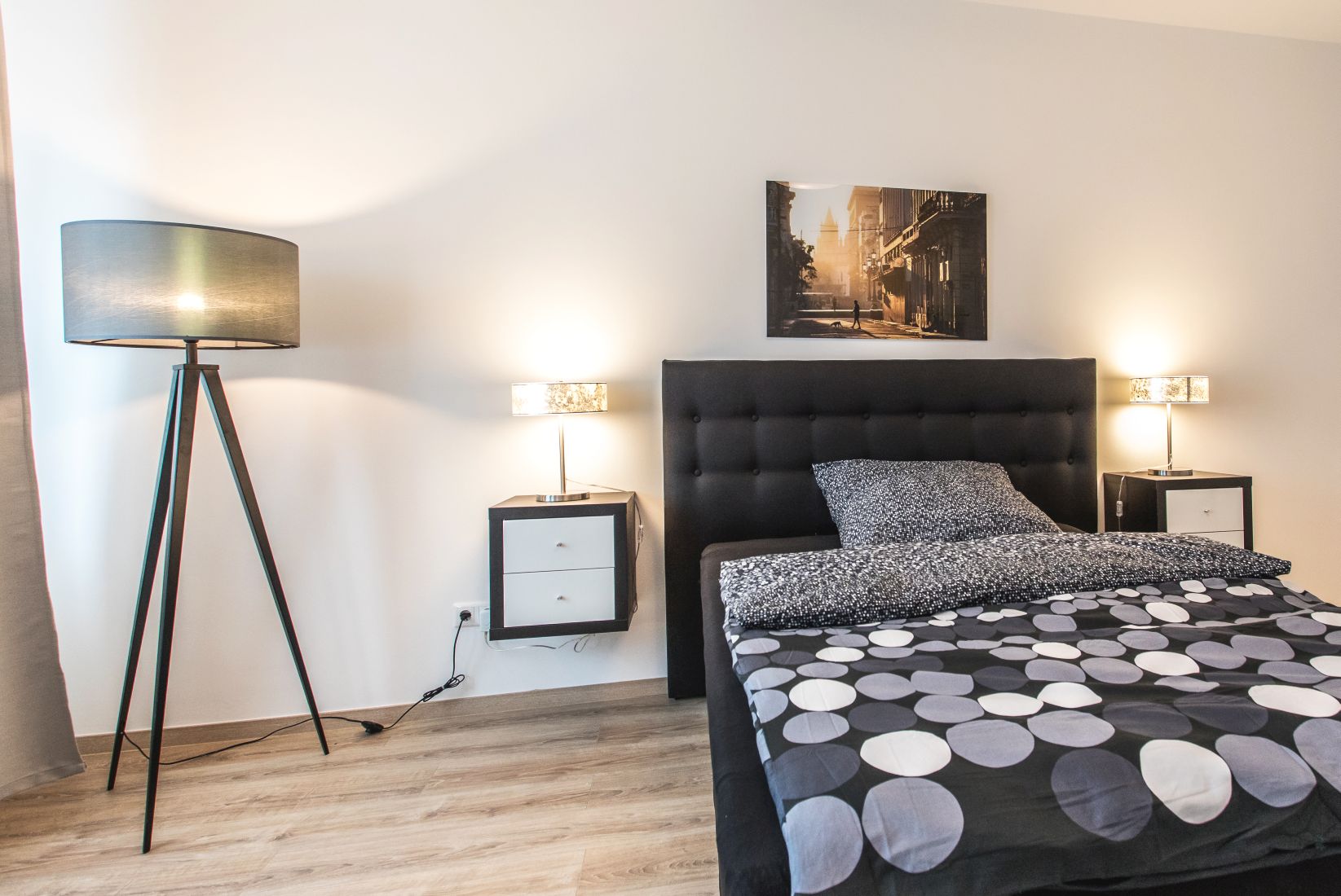 Everything is modernly furnished, each room of course individually lockable and comfortably furnished with curtains, pictures, box spring bed incl. bedding and bed linen, bedside table, closet, desk, chair and TV, the common rooms: kitchen incl. washing machine, dryer, ceramic hob with oven, fridge-freezer, dishwasher and a basic set of cutlery and crockery, iron and ironing board are also available.