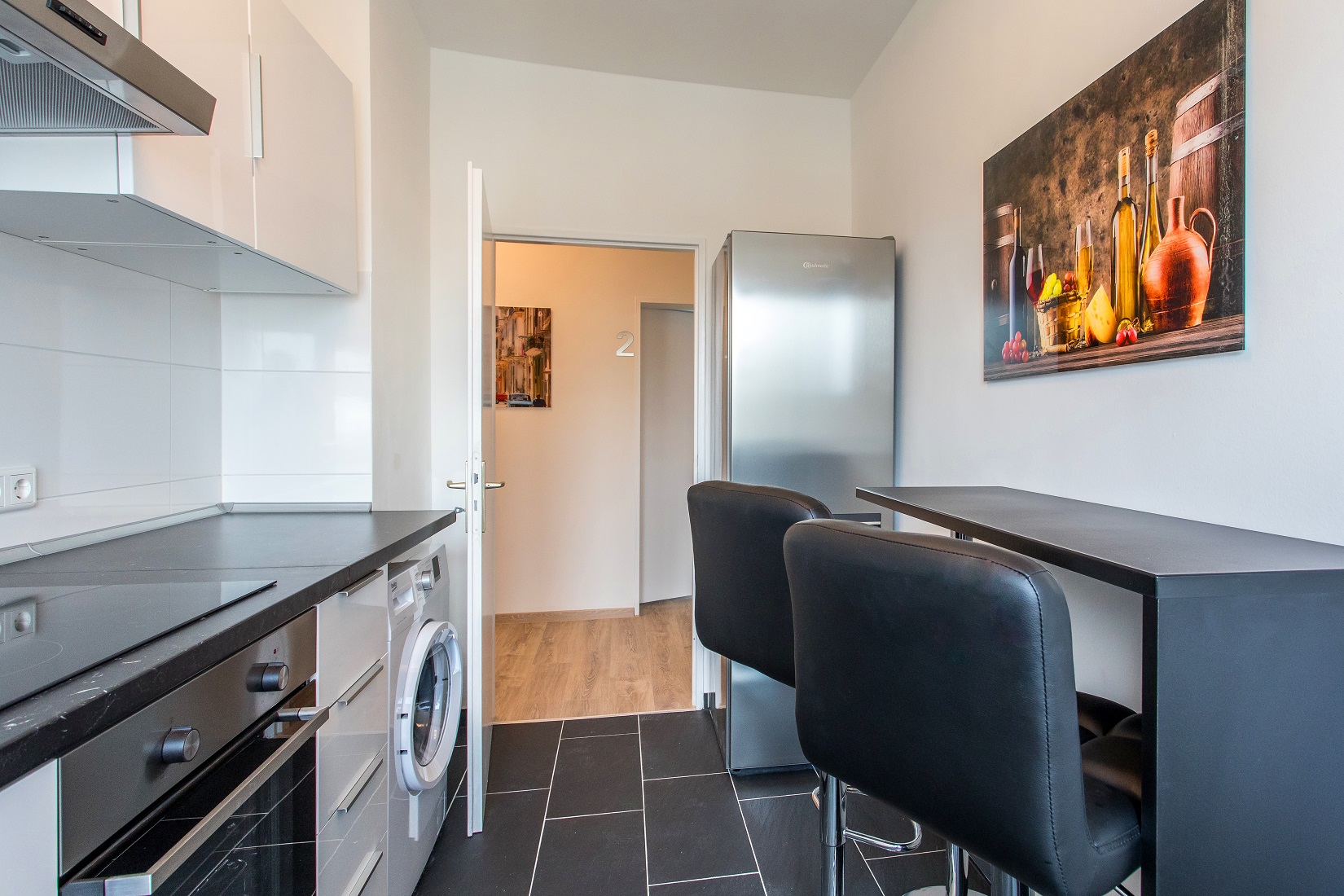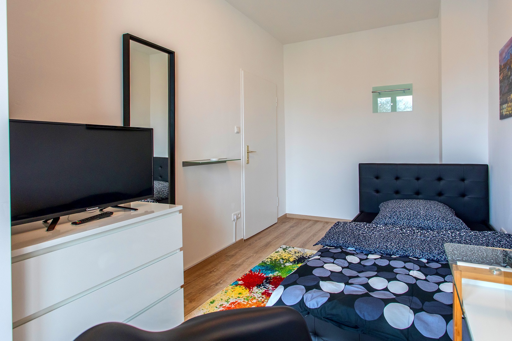 Everything is modernly furnished, each room of course individually lockable and comfortably furnished with curtains, pictures, box spring bed incl. bedding and bed linen, bedside table, closet, desk, chair and TV, the common rooms: kitchen incl. washing machine, dryer, ceramic hob with oven, fridge-freezer, dishwasher and a basic set of cutlery and crockery, iron and ironing board are also available.