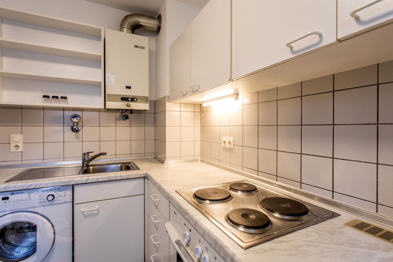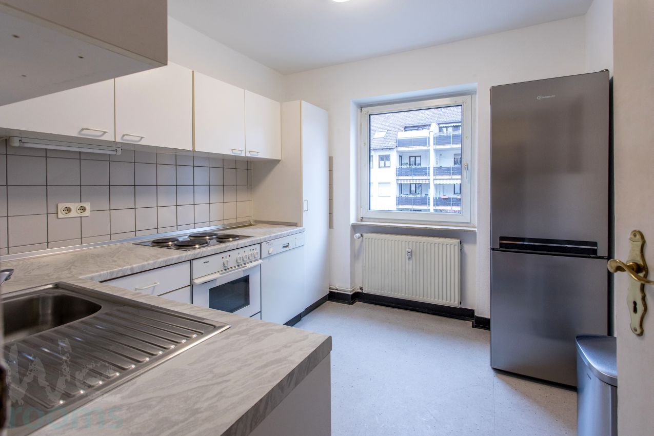 Each flat comprises a total of 3 rooms for individual allocation, the smallest room with approx. 12m² even has its own balcony and is equipped with a 1.20m box spring bed, the two other larger rooms are approx. 17m² to 18m² in size and are each equipped with a 1.40m bed. All rooms are furnished with pictures, bed incl. bedding and bed linen, bedside table, wardrobe, desk and chair. The common rooms: kitchen including washing machine, cooker with oven, fridge-freezer, dishwasher and a basic set of cutlery and crockery, iron and ironing board are also available.