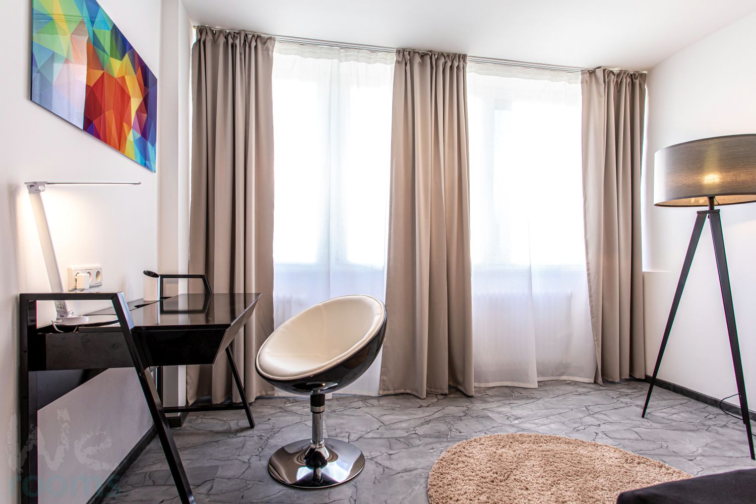 The entire floor is professionally cleaned twice a week in the communal areas. The location is very central, 250m away from the main station, directly in the Frankfurt railway station area, all banks are directly in front of the front door or in direct proximity.
