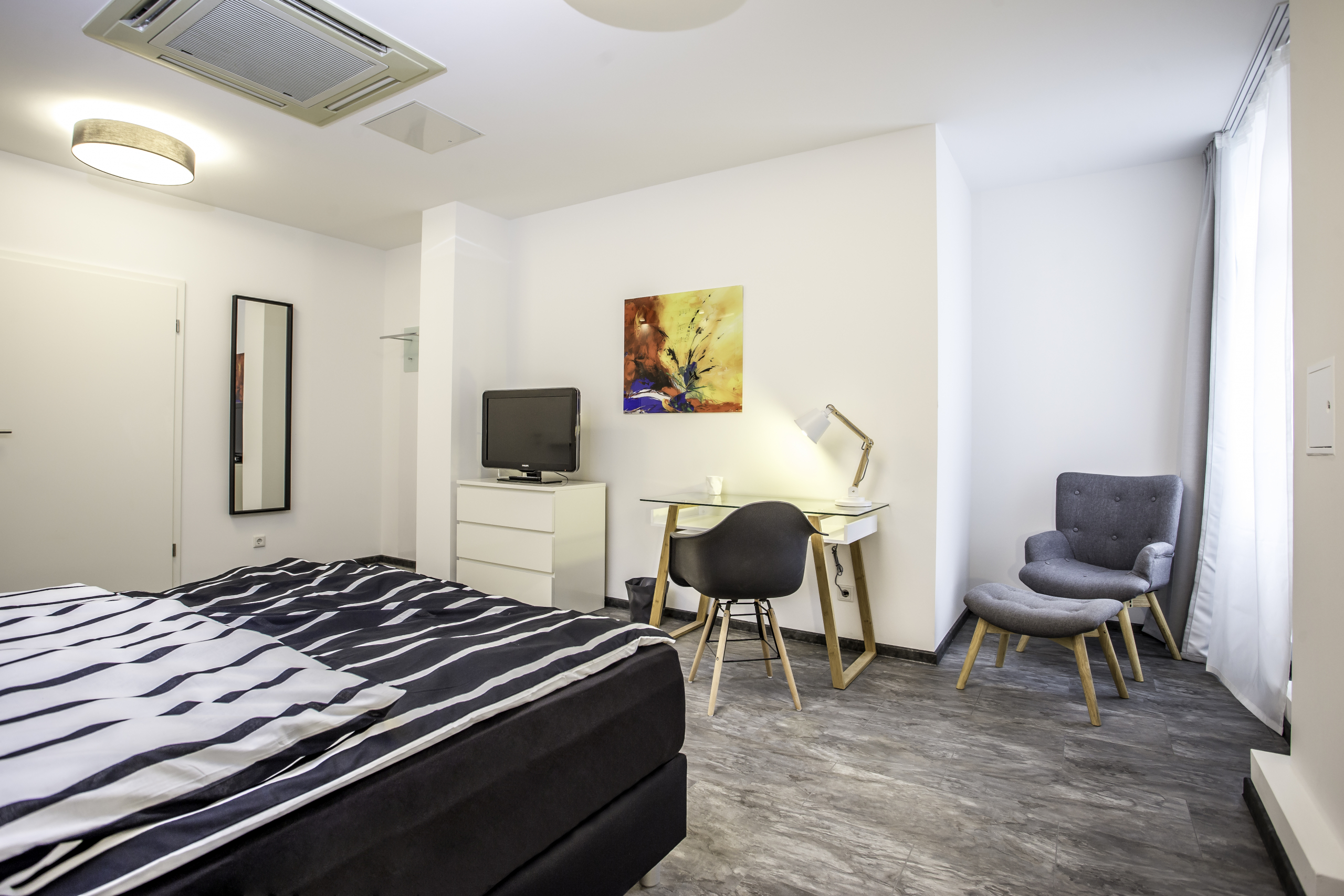 The room features a spacious bed, wardrobe, flat screen TV, bedside table, desk, desk chair, bedding (pillow 80×80, duvet 140×200) and matching bed linen.