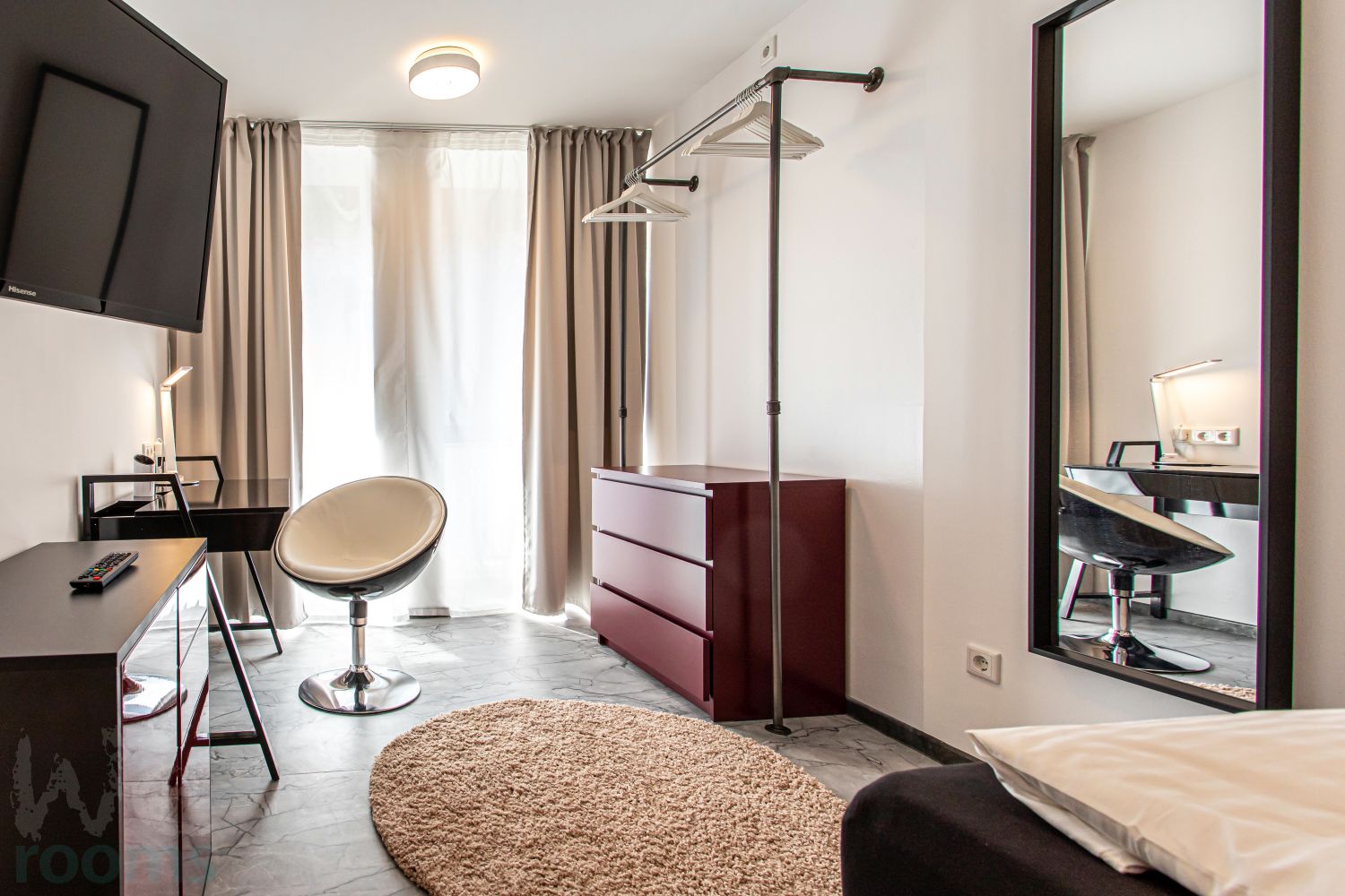 The equipment of each room includes a spacious bed, an open wardrobe, flat screen TV, bedside table, desk, desk chair, bed linen (pillow 80×80, duvet 140×200) and the matching bed covers.