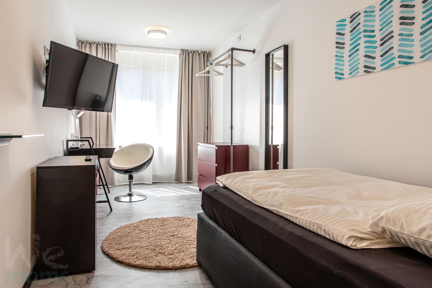 The equipment of each room includes a spacious bed, an open wardrobe, flat screen TV, bedside table, desk, desk chair, bed linen (pillow 80×80, duvet 140×200) and the matching bed covers.