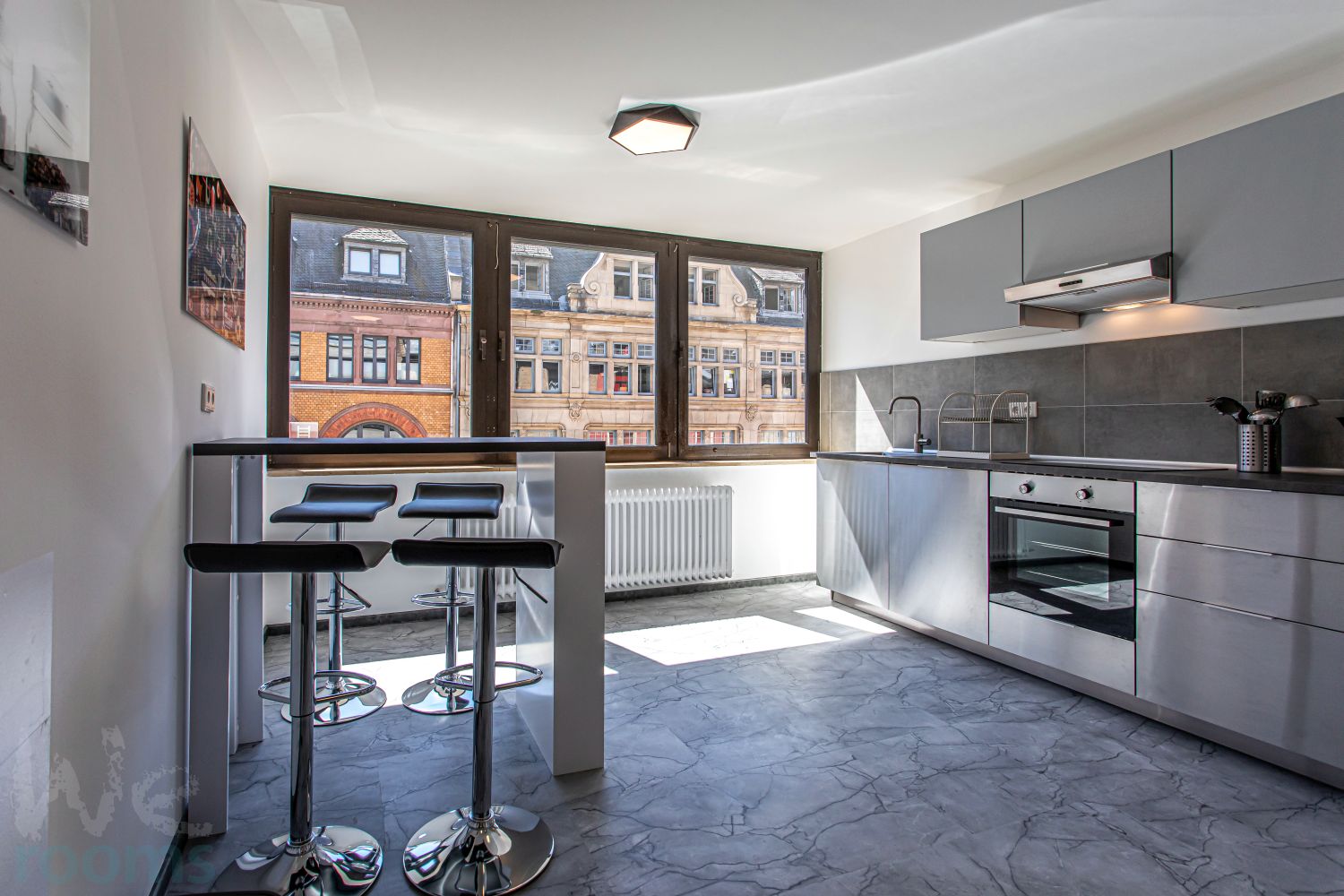 In addition, each room on the floor is equipped with its own WIFI router with 6,000 kBit/s cable line. In the shared flat there is an open kitchen area completely furnished with crockery, cutlery and cooking utensils with electric cooker, dishwasher, as well as seating for the common use of all residents.