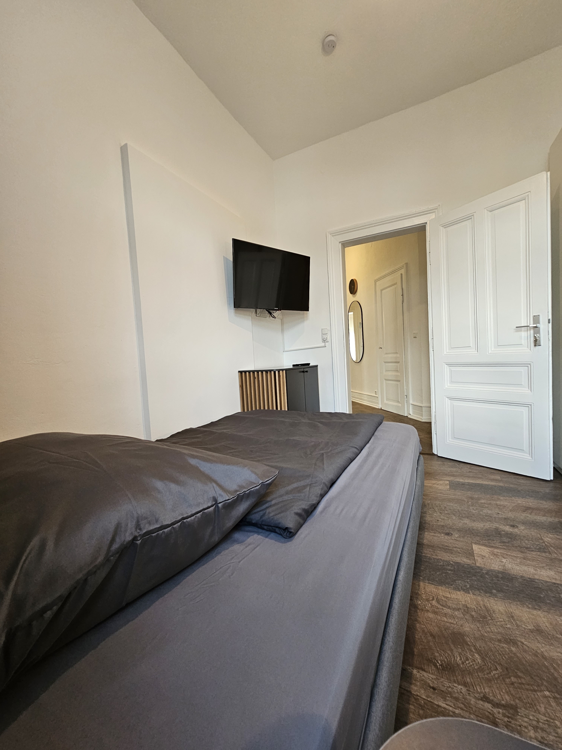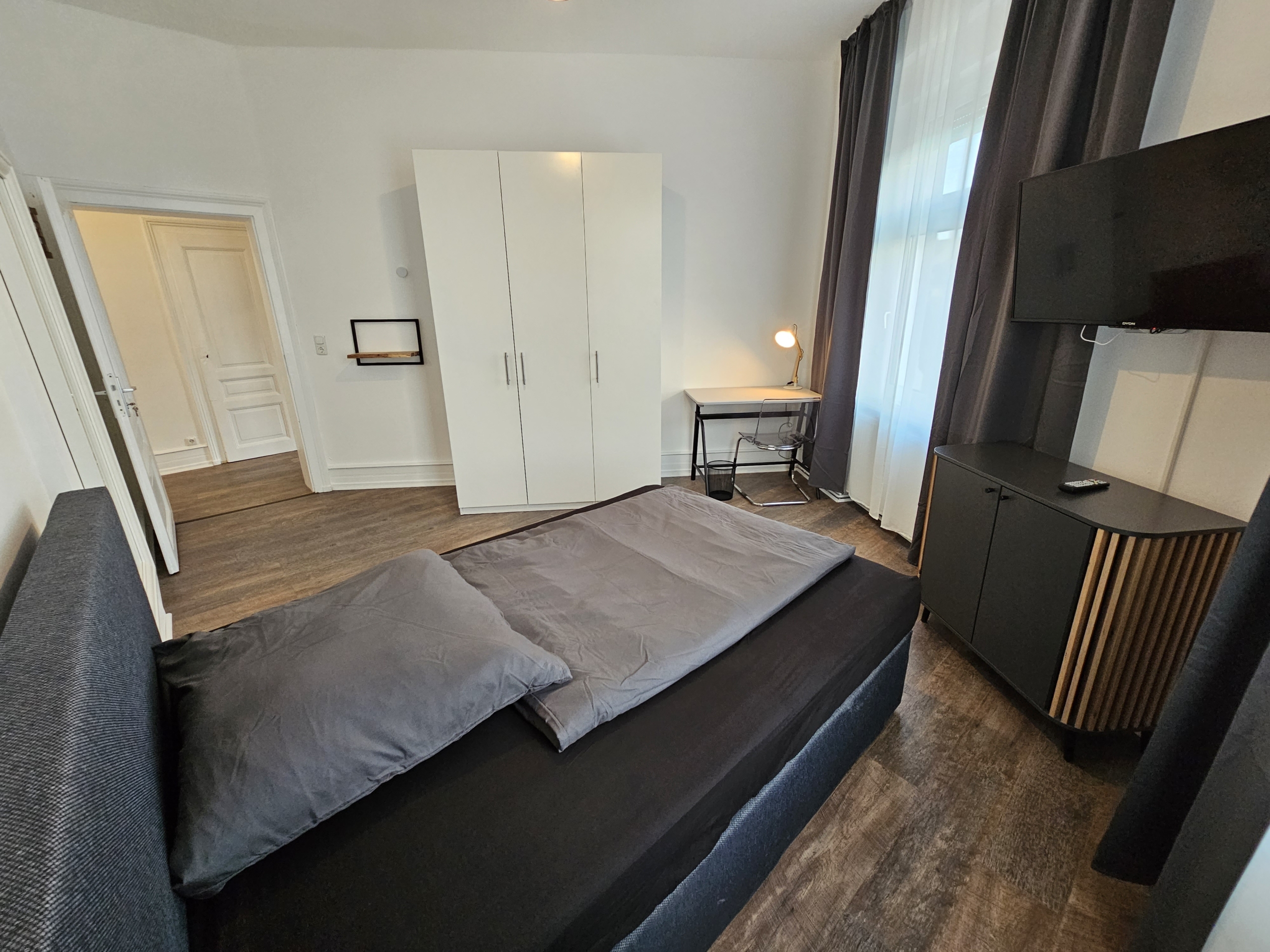 4 rooms were freshly renovated in an old building apartment (high ceilings!) modern and equipped among other things with box spring beds. Each room also has a desk, an open wardrobe and a chic commode. Bed linen + covers are of course also included. For all residents the kitchen with complete fitted kitchen is available. 1 bathroom with shower and toilet is shared by all flatmates and of course there is also a washer-dryer.